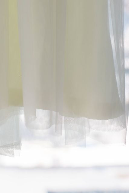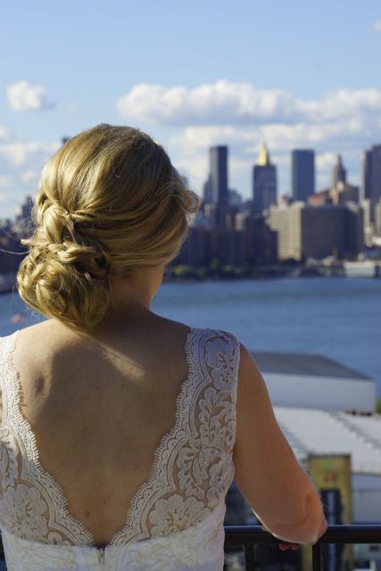 The beautiful and delicate detailing of the lace is combined with a feminine silhouette for a romantic and soft feel. The sweetheart neckline and built in corset create a supportive and trim look while the tulle skirt is soft and flowing without being overwhelming. The lace has golden threads throughout and the open back with the deep v shape makes a real statement. Custom belt with crystals and pearls can be included. (Dress $1800; Belt $100)