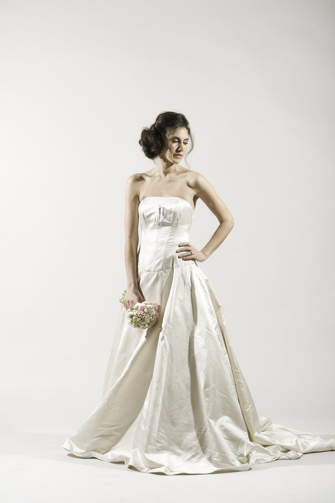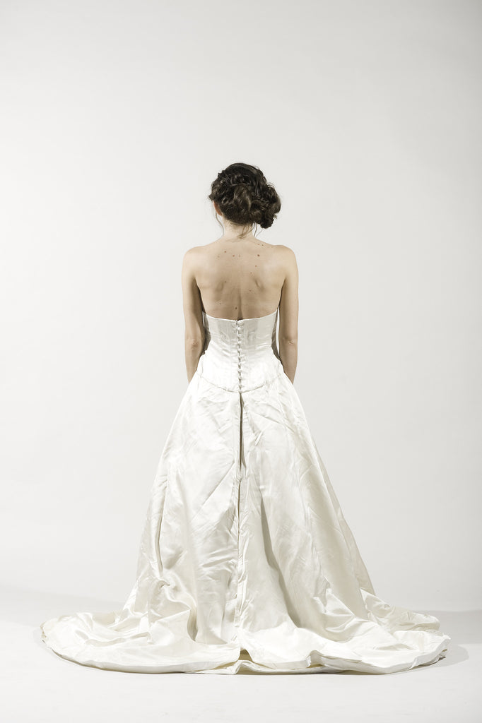 Strapless satin A-line ball gown features a slimming dropped waist accented with sleeveless lace overlay top. Gorgeous lace crossover keyhole at back & secured closed with self covered buttons. Latte sash adds drama & some color.