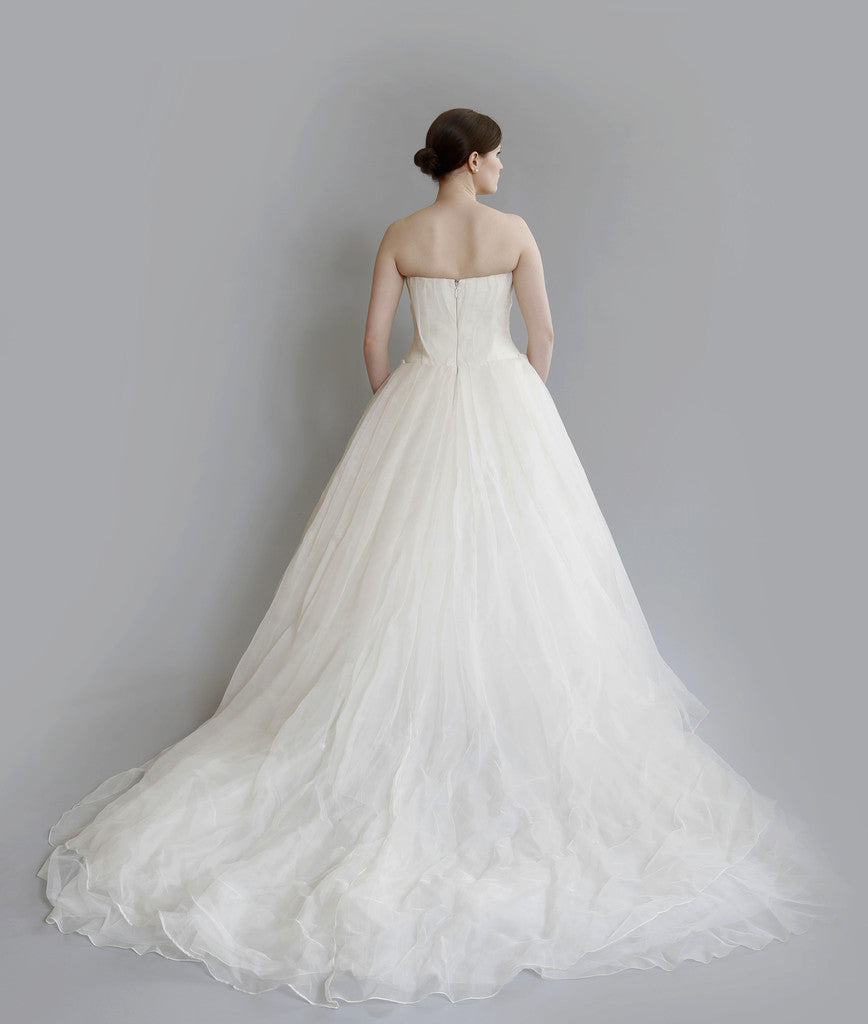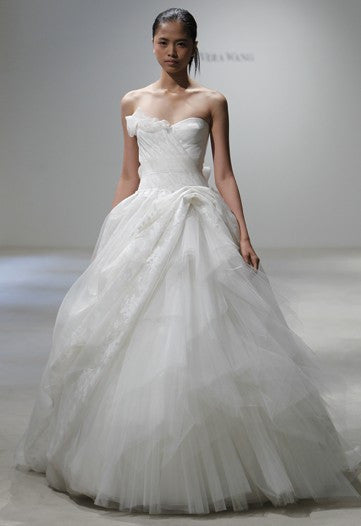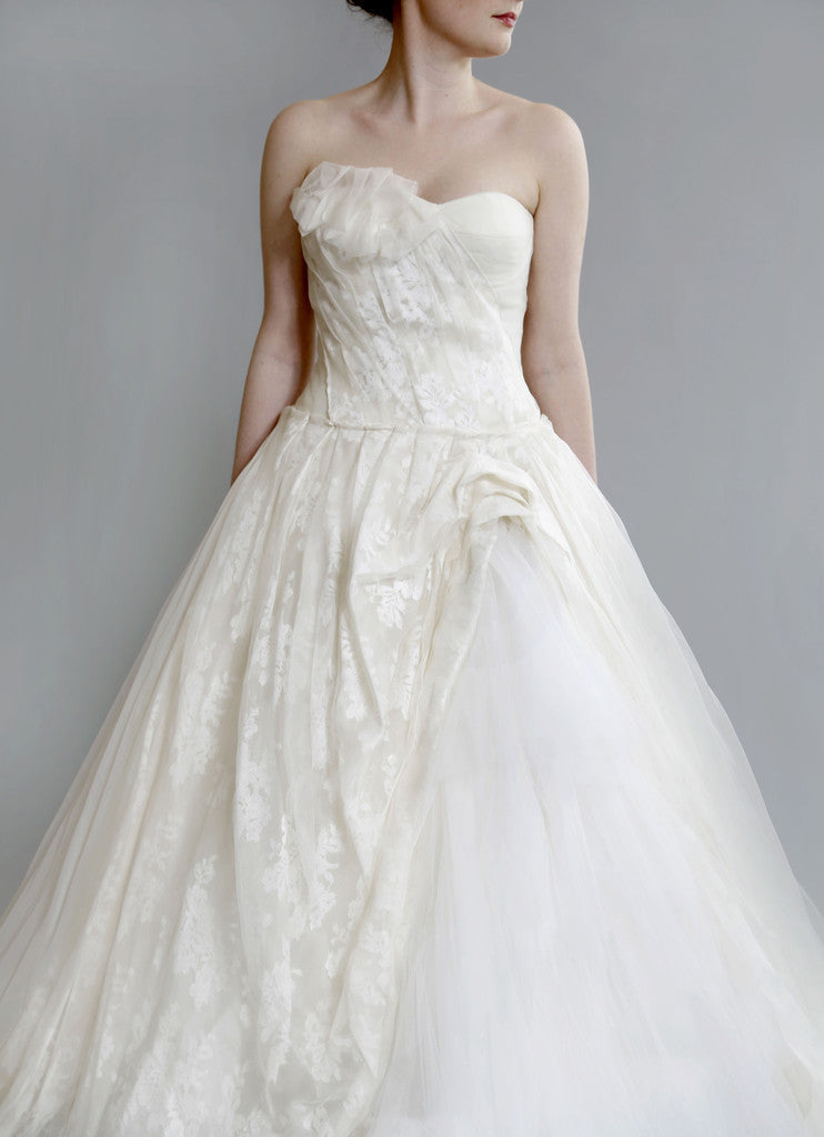 Vera Wang's Freida' Gown is constructed of organza with a dropped waist, strapless bodice, and full ball gown skirt. From Vera Wang's Spring 2011 collection, the dress is a highly coveted style. Sweetheart bustier neckline with painted lace details on organza. Dress Tag Size 6. Excellent once worn condition, professionally cleaned. Minimal alterations, taken in slightly in waist.
