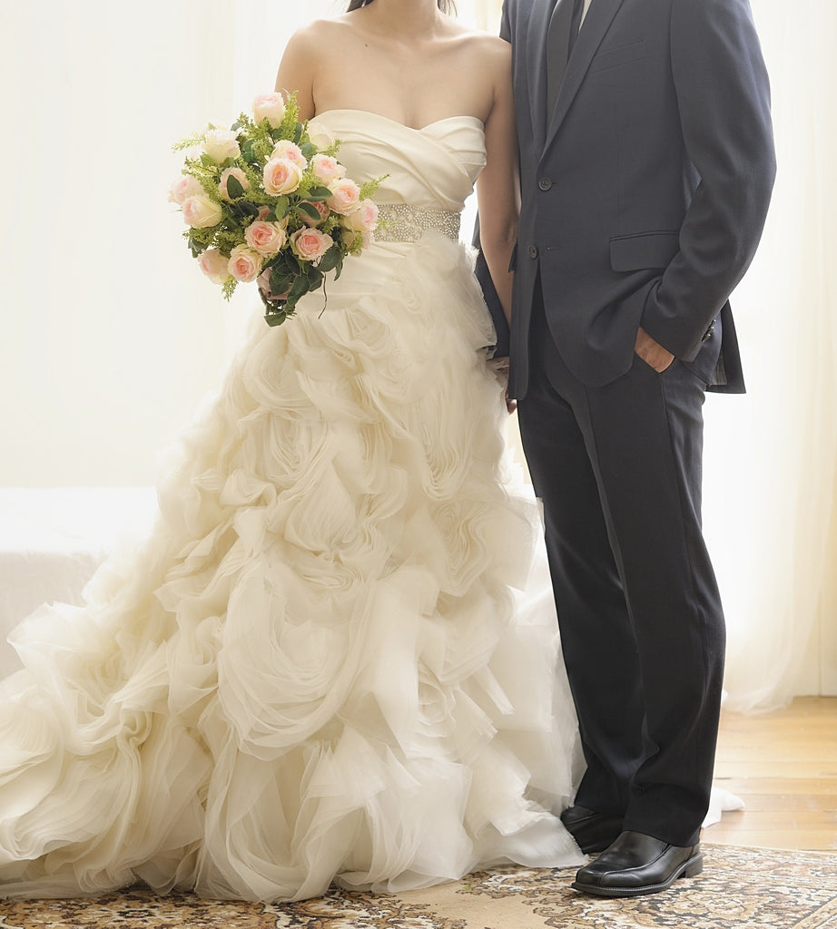 From Vera Wang's Luxe Collection, the stunning Ghillian gown is a flattering strapless sweetheart full A-line gown with an asymmetrically draped drop waist bodice and chrysanthemum organza blossom skirt. This dress has been once worn & is in great condition.