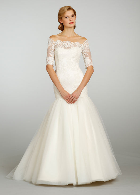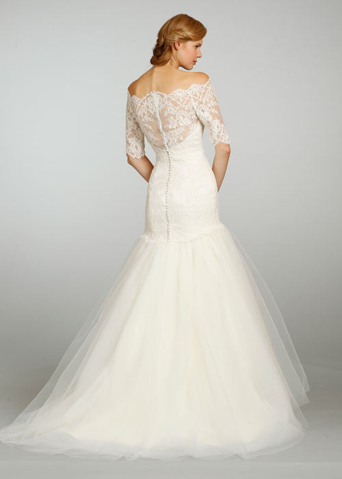 Ivory Jim Hjelm Style 8313, tulle bridal ball gown. Featuring a alencon lace elongated bodice with three quarter sleeves, covered buttons, chapel train. This dress has never been worn or altered.