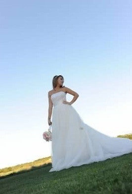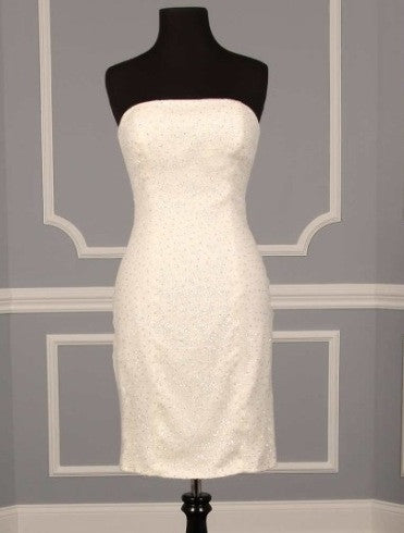 This beautiful badgley mischka COUTURE GOWN features a removable tulle skirt with crystal beaded accents to create the classic princess BALL GOWN wedding dress. Then, with a quick un-zip of the skirt, the diamond white beaded short cocktail dress is revealed. The Gorgeous beaded dress is topped with Soft tulle netting for a whimsical look. Dress tag size 8, street size 6. Bride was 5'5'' in heels with a 28 inch waist and 34B bust. Dress was worn once and in is excellent condition.