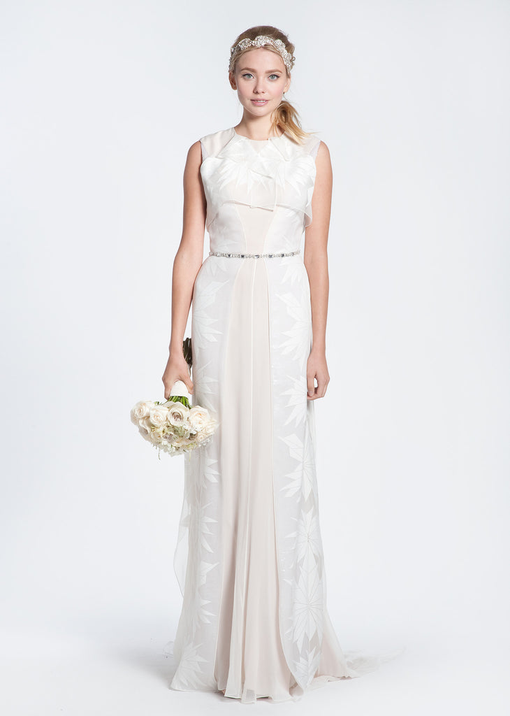 With a crewneck & floral burnout detailing, this Gwyneth blush and floral wedding dress from Indian designer Bibhu Mohapatru has amazing movement. The outside princess panels on the bodice are embellished with a subtle but sparkly sequins.