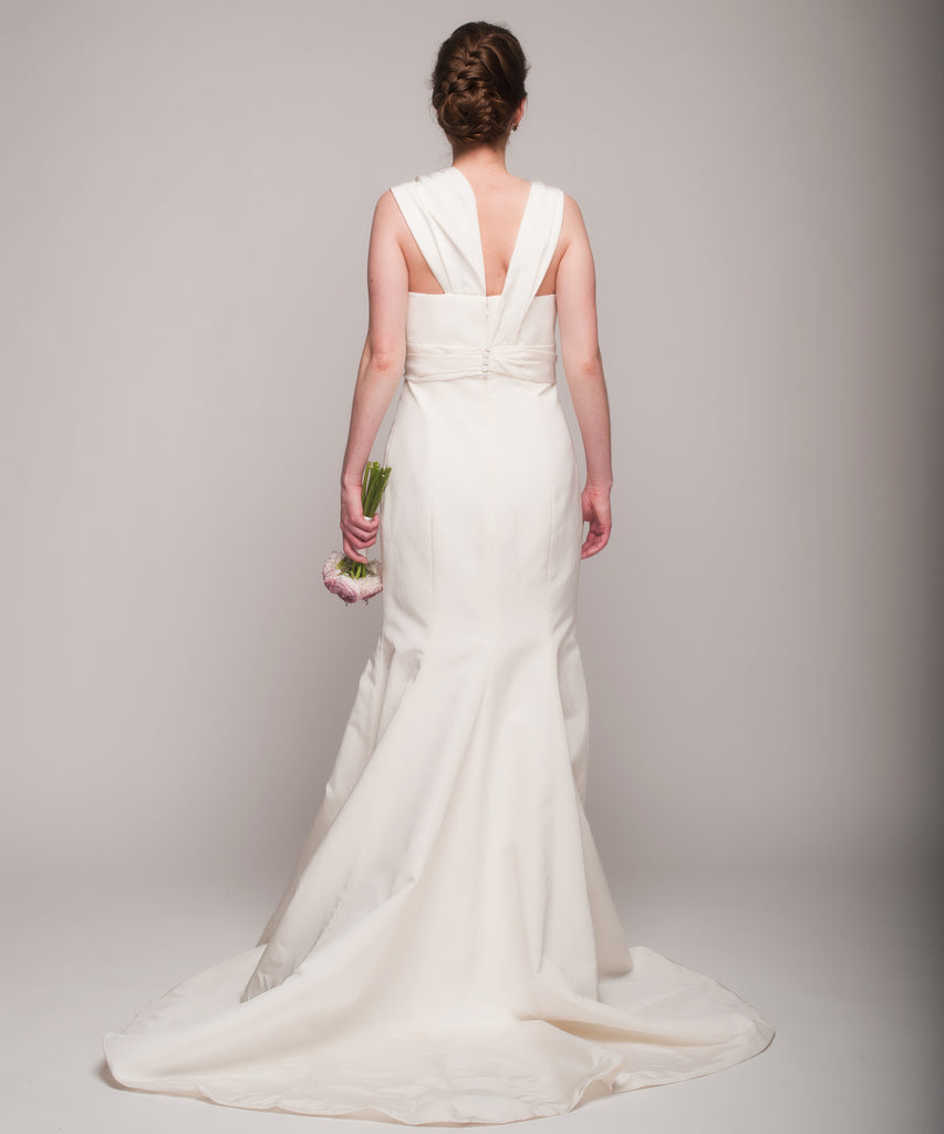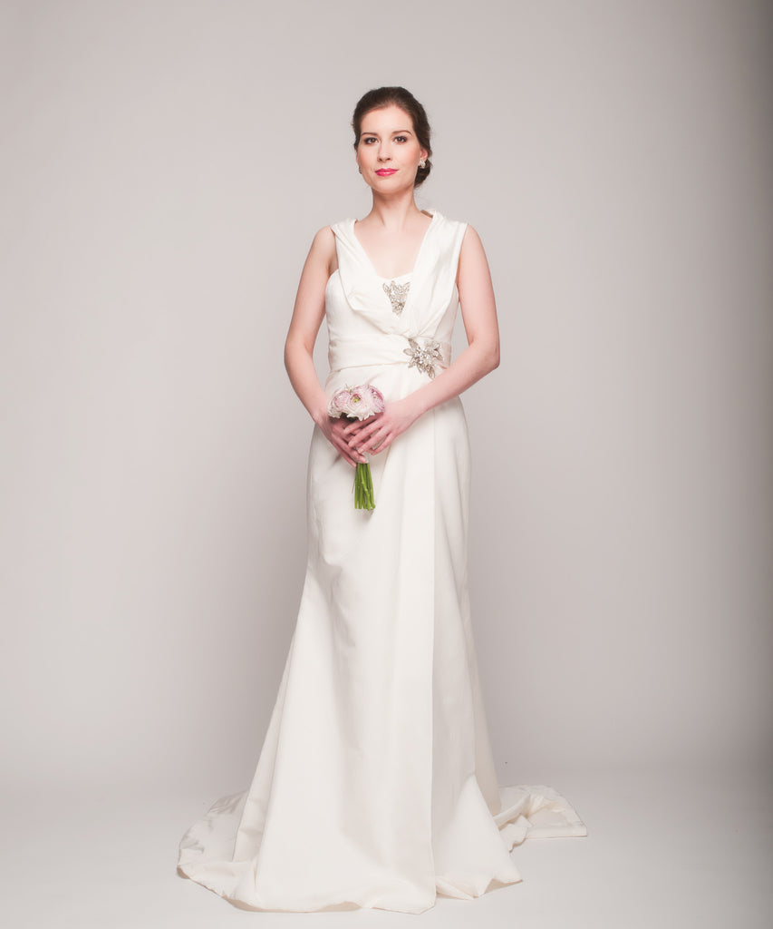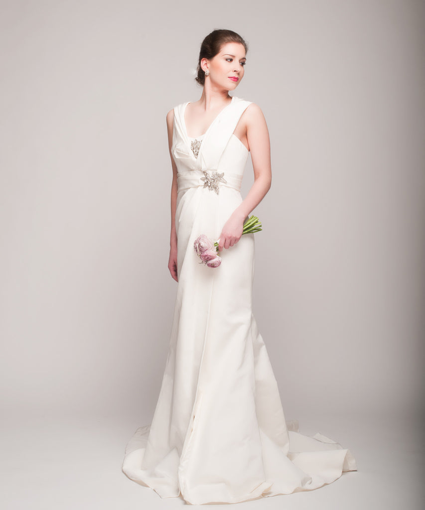 Simple yet stunning, this Carolina Herrera John Singer Sargeant wedding dress features embroidered floral brooch on bodice & opening of skirt. The sweetheart portrait neckline flatters & twists into empire seam. Straps are asymmetrical and can be worn on or off the shoulder. Slight flared skirt is complimented with a slit to show a bit of leg.