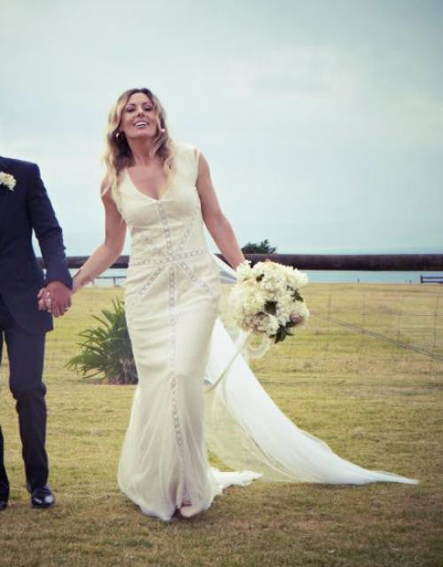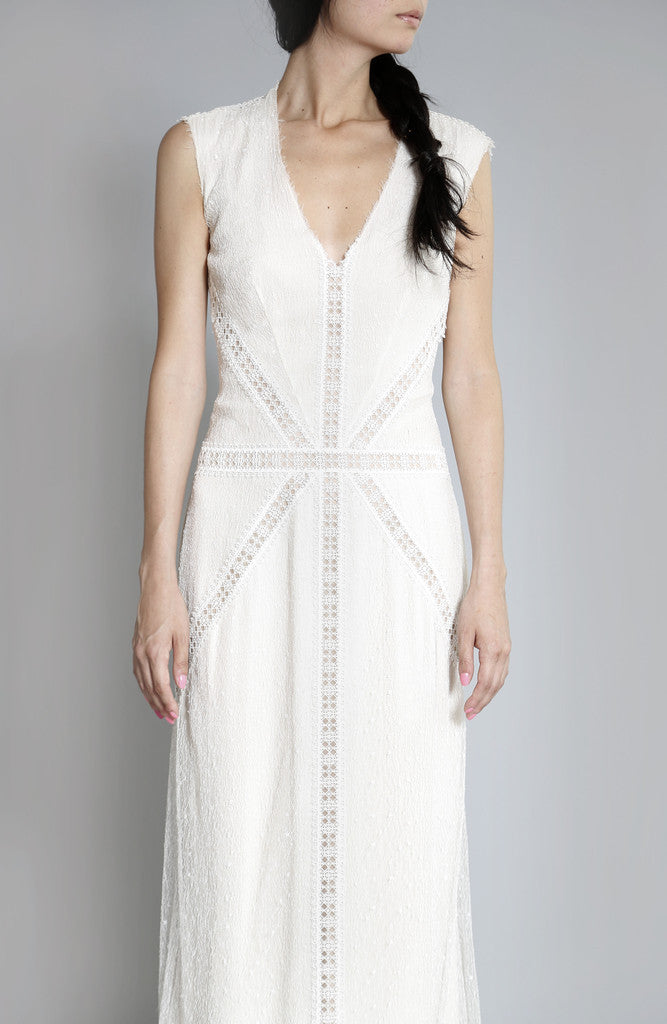 The Caroline Seikaly 'Joanna' wedding dress has French lace with a pleated silk chiffon star-shaped train. The lace is left raw/unfinished at the neckline and sleeves. The dress has a distinct feminine softness with a structured edge. This dress was made custom by Caroline's studio in Paris and includes a separate nude colored full length silk slip to be worn underneath the gown. This dress has been once worn & is in excellent condition.