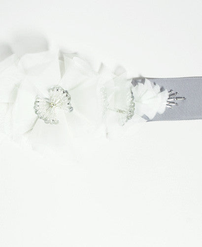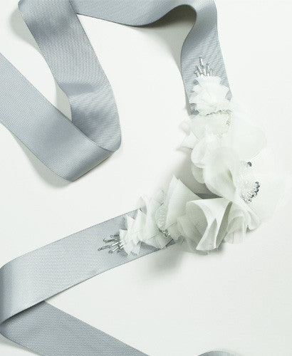 The romantically layered silk organza petals create a whimsical floral design on this pale grey grosgrain Cassidy belt. This belt has 1920's style beading which adds the perfect touch of detail and shimmer. This belt is all hand beaded and measures approximately 2" wide by 6' long. The detailing measures approximately 10" long.