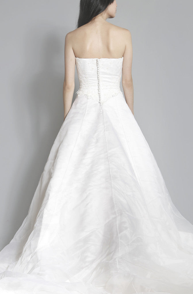 This dress is a custom design by Cocoe Voci. A strapless ball gown, this dress is a classic dream for the bride that wants to feel like a bridal princess. The dress is constructed of a light silk with an organza overlay. Italian lace covers the bodice and forms a border along the bottom of the dress. The bodice also features inlaid pearl and crystal detail, intricate and luxurious. The train of the dress is 4 feet long, and the overlay is slightly longer than that (there is a double bustle system).