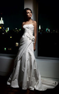This gorgeous Melissa Sweet strapless A-line boasts a flattering ruched bodice, dimensional petal detailing, and an asymmetrically draped skirt. Elegant silk radzimir in a beautiful ivory color. This dress has been worn once & kept in excellent condition.