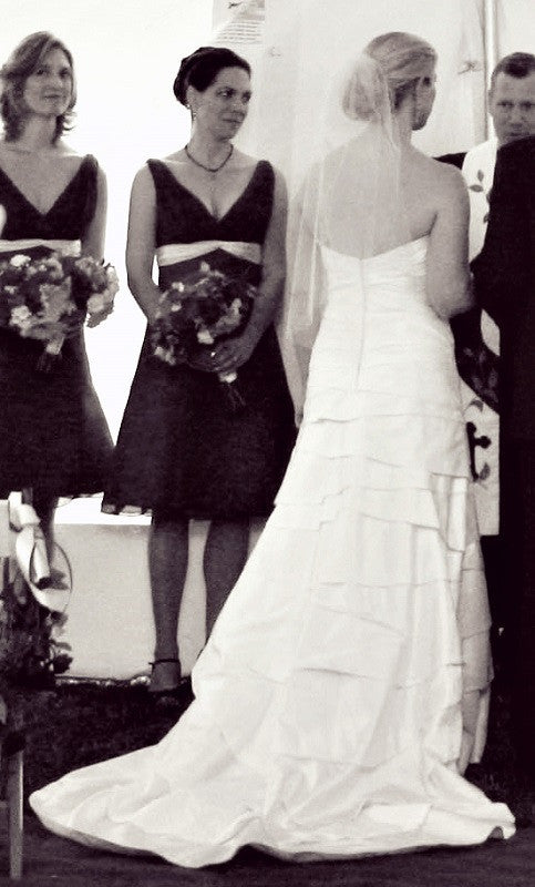 This gorgeous silk taffeta wedding dress was custom-made by Mary's Designer Bridal Boutique in Annapolis, MD. The dress features a strapless neckline with built-in support and is floor-length with a train that bustles beautifully. Its color is slightly off-white, and the silk taffeta material gives it a mild shimmer. As shown in the photos, it has layered strips that get increasingly wider towards the bottom and give it a unique, contemporary look. It was used for a matter of hours and has since been dry-cleaned and carefully stored.