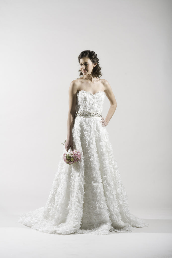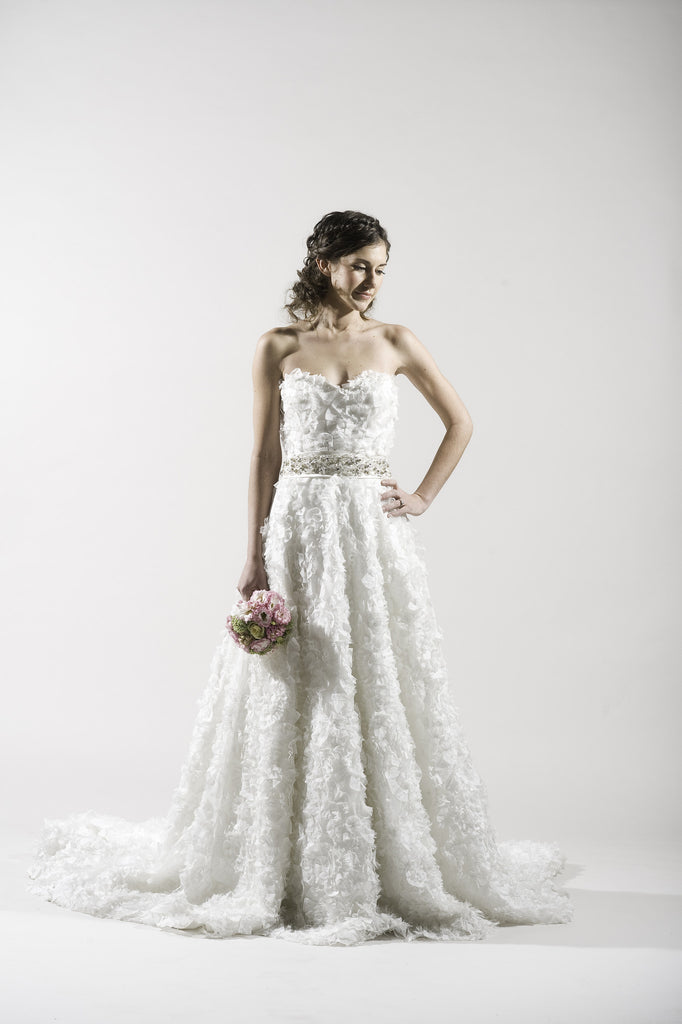 Exclusive Dennis Basso for Kleinfeld Style 6255GGGR. This luxurious blush strapless A-line wedding dress features three dimensional organza flowers & attached crystallized belt. The form fitting bodice features a sweetheart neckline & natural waist.