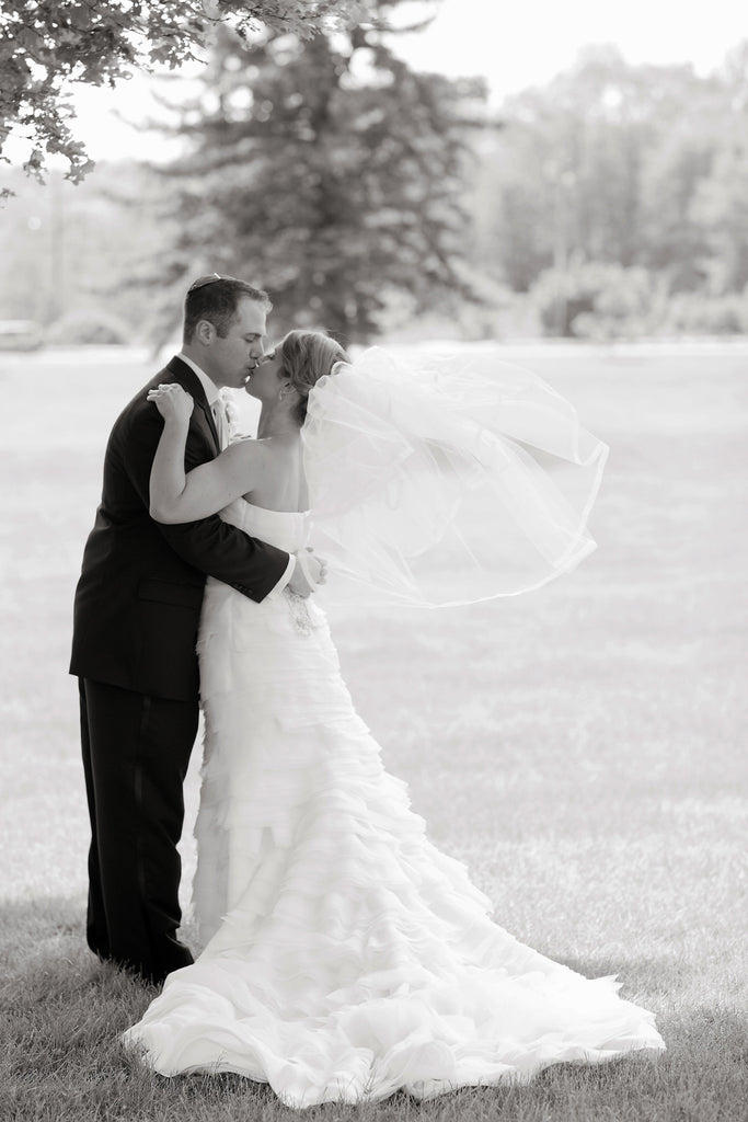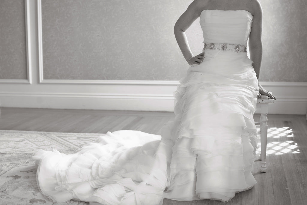 Gorgeous Enzoani strapless organza Faye wedding dress. Straight neckline & pleating and tiers that is reminiscent of the Vera Wang Diana. Color coded bustle makes for easy movement. Belt not included. Dress is a size 4. Dress has been once worn & is in excellent condition.