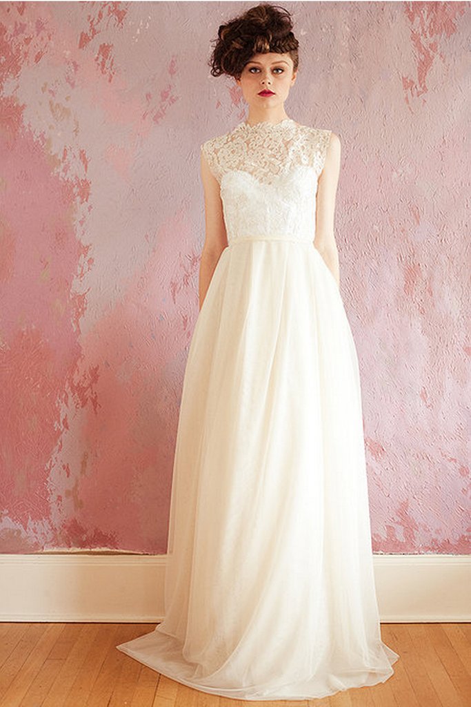 The beautiful and delicate detailing of the lace is combined with a feminine silhouette for a romantic and soft feel. The sweetheart neckline and built in corset create a supportive and trim look while the tulle skirt is soft and flowing without being overwhelming. The lace has golden threads throughout and the open back with the deep v shape makes a real statement. Custom belt with crystals and pearls can be included. (Dress $1800; Belt $100)