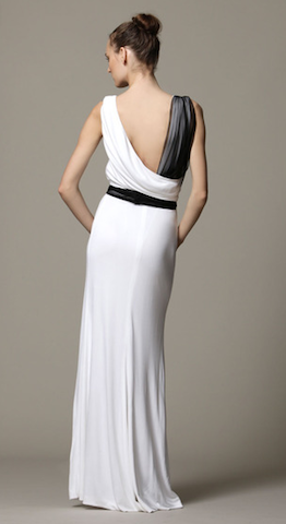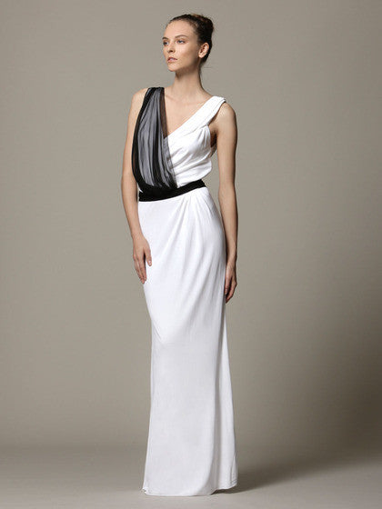 This is a white evening gown with sheer black silk sash by Gianfranco Ferre. Great dress for a black tie event or wedding. This dress is an Italian size 38, which is a United States size 4 or 2. The sizing on this gown seems to run small however, so I would say it is closer to a size 2. Original price: $3,440 Additional details: Jersey sleeveless contrast sash gown with deep cross over v-shaped neckline. Contrast silk chiffon sash, draping, pleats at bodice, gathers at empire waist, open side, back and optional contrast silk chiffon belt with adjustable four hook and eye closure. Hidden side zipper with hook and eye closure. Partially lined in silk with a finished hemline. 62 inches from shoulder to hemline. Material: 100% viscose shell. 100% silk trim. 100% silk lining Brand: Gianfranco Ferre Origin: Italy