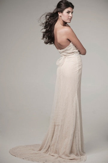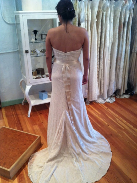 Ivy & Aster 'Violet' gorgeous antique colored strapless sweetheart wedding gown. The gown is a body conscious dress with a starburst bodice with a fitted skirt and godet pleats. Sash is currently attached to dress but can be snipped off, sash was custom made by an Etsy seller. Dress has been once worn & is in great condition.