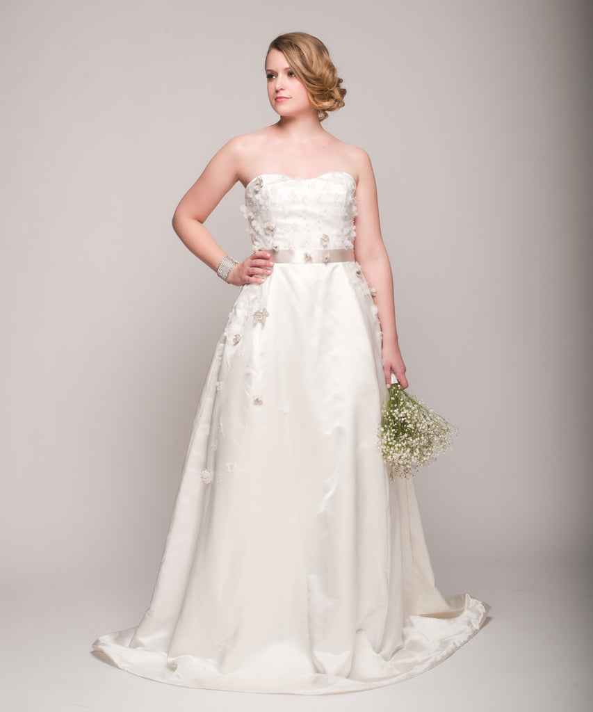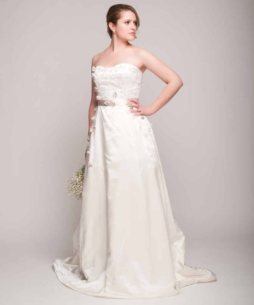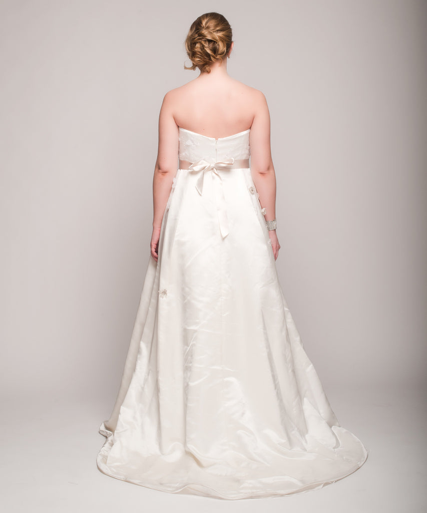 This gorgeous Jane Wang 'Brandy' wedding dress is Duchess Silk with an A-line, princess silhouette. It has stunning cascading butterfly appliques down the front of the gown with beaded embellishment. This dress is strapless and floor length with a chapel train. The dress comes with a silver taupe sash at waist and has side seam pockets that add fun to the gown. There are removable cups added to bust. It is a dress size 12.