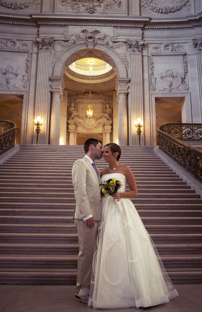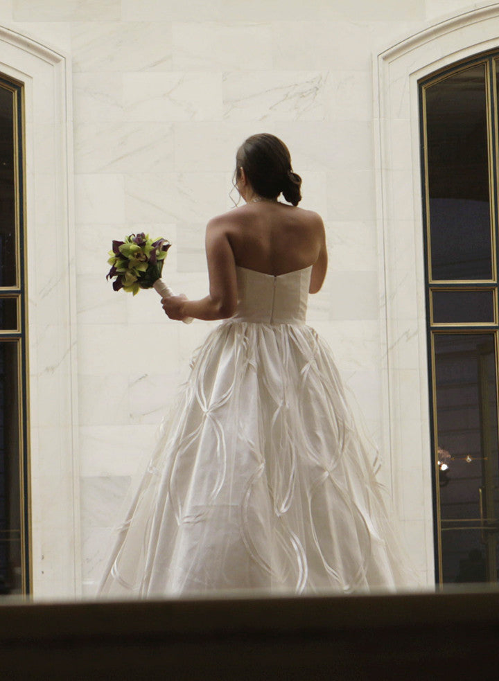 Inspired by female architect, Zaha Hadid, this Jorge Manuel ivory A-line strapless linen ball gown is classic with intricate detailing. With an overlay of tulle and hand encrusted bias piping figure 8 detail on skirt and chapel train, all eyes will be on you. The bias piping hand-made motif is hand-encrusted at bodice. This dress has been worn once & is in great condition.