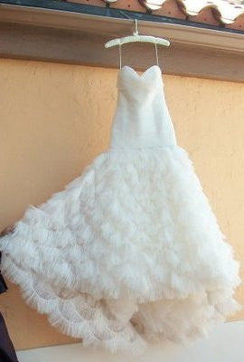 Stunning Kenneth Pool ivory strapless mermaid gown with shirred sweetheart bodice, the Fashionista. This gown features a low dropped waist revealing a gorgeous skirt made up of layers upon layers of seamed tulle with clear paillettes. Dress has been once worn & is in excellent condition.