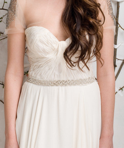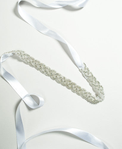 Made by Kirsten Kuehn, the Austine Sash is a classic crystallized braid belt creating a Grecian goddess feel to any dress. The dress is made with Austrian crystals and silver glass beading to really make it sparkle. The ribbon closure of the sash allows for universal sizing.