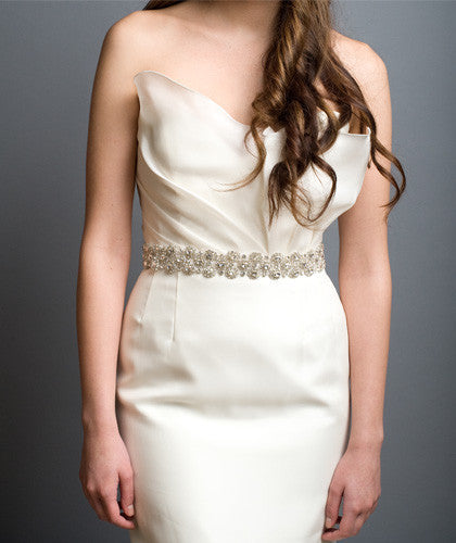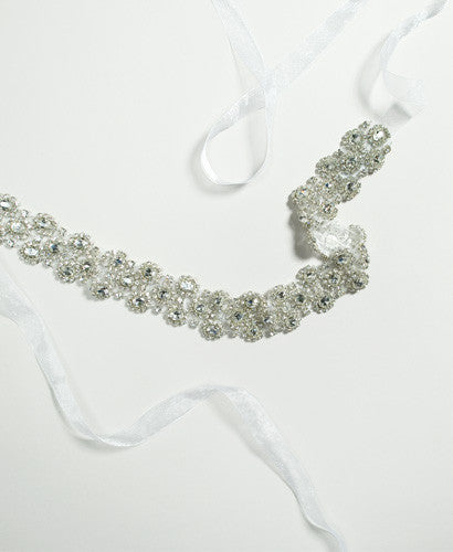Made by Kirsten Kuehn, the Cameron Sash is decorated with an array of oval cut Austrian crystals and it sparkles with timeless elegance. Dimensions are 18"L by 1.5"W.