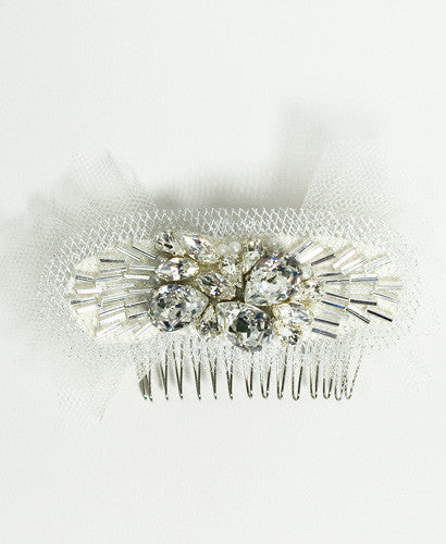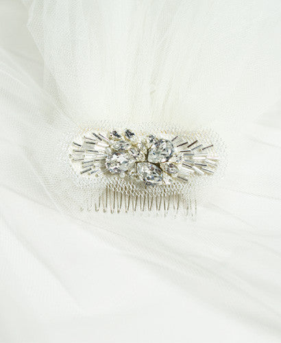 This cascading off white fingertip length Lenora veil is the perfect addition to any wedding gown. Decorated with Swarovski crystal, pearl, and tulle, this head piece adda a little glamour. The best part is that the hair piece is detachable so you can wear it after the ceremony at the reception. This stunning accessory comes at three pieces: tulle veil, beaded head piece, and snap in hair comb. The hair comb measures approximately 5" and the veil measures approximately 45" long. This piece is exclusive to Nearly Newlywed. 'Hushed Commotion for Nearly Newlywed'