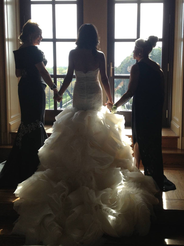 Stunning and very sought after Lazaro ivory organza mermaid ball gown with a custom sweetheart neckline, sheer corseted Alencon lace elongated bodice, with a layered asymmetrical organza skirt, and dramatic chapel train. The dress features buttons down the back and a bustle created by tailors at Madame Paulette in Manhattan. This dress has been once worn and is in excellent condition.