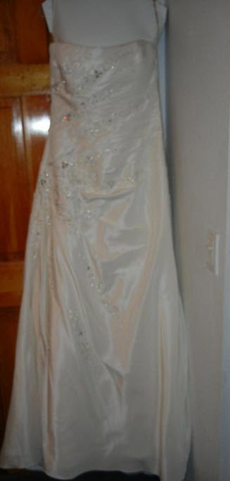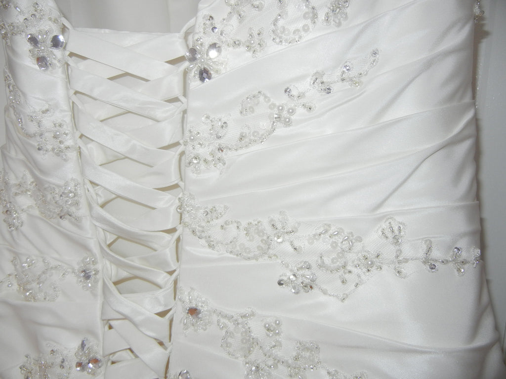 This beautiful Maggie Sottero Rachelle dress is ivory and A-line with a corset closure back. It has a scoop neckline but can be altered to a sweetheart neckline. Rhapsody taffeta creates this remarkably flattering gown. Asymmetrical pleating and embellished lace motifs with Swarovski crystals are scattered diagonally throughout the gown. This gown is very slimming and the corset closures accomodates a variety of body shapes. Gown was never worn at an event. Dress is a size 16 tag size.