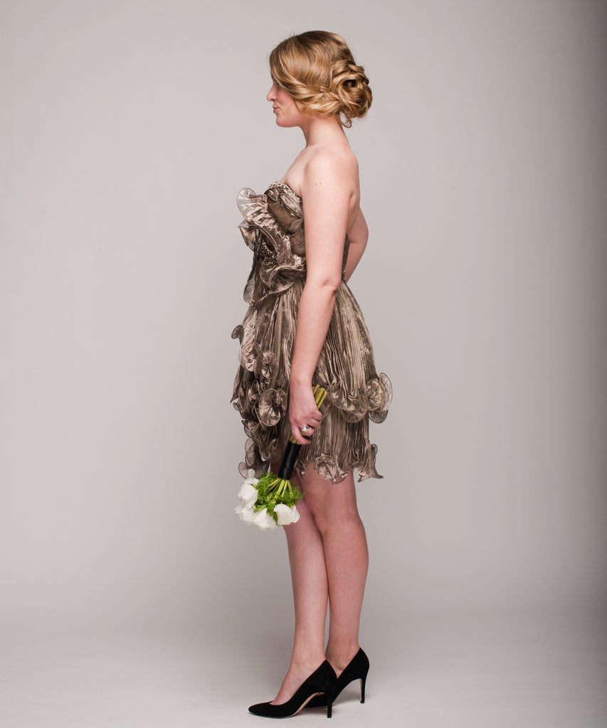 Gold & Bronze Knife Pleated Marchesa dress. Dress features crystal and bead embellishment at bodice. Dress is strapless, has pleated embellishment at bodice, a softly structured internal bodice, asymmetric ruffles at bodice, a tiered ruffled skirt, a concealed zip fastening at back and is fully lined. Worn by Anna Kendrick. Few small crystals missing, not noticeable. Dress is new, never been worn.