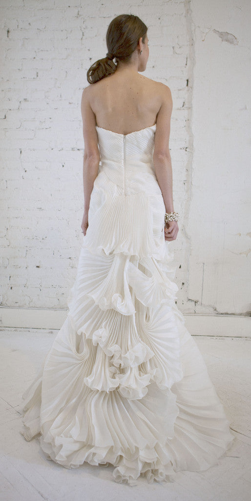 Ivory silk Marchesa gown with asymmetric cascading pleated ruffles. Marchesa bridal collection gown has a strapless bodice, ruffled asymmetric draped pleated panels, cascading style throughout. Concealed hook and zip fastening at side, zip-fastening boned internal bodice and is fully lined. Dress is from Marchesa Spring 2010 collection. Incredible construction and design. Excellent once worn condition, professionally cleaned and pressed. Altered down to fit a considerably smaller frame. Very minor fraying on edges of a few pleats.