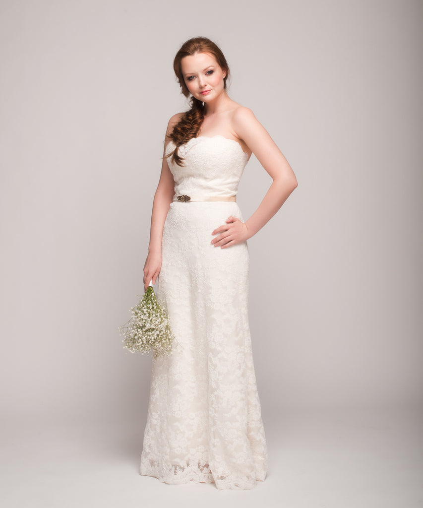 Gorgeous French Alencon Lace & Organza Modern Trousseau Devon gown. Fully lined with silk & custom buttons at back for the ultimate romantic look. A simply chic look easily changed to modern, romantic or glamorous by adding accessories. This dress has never been worn & is in excellent condition. Dress comes with optional champagne sash.