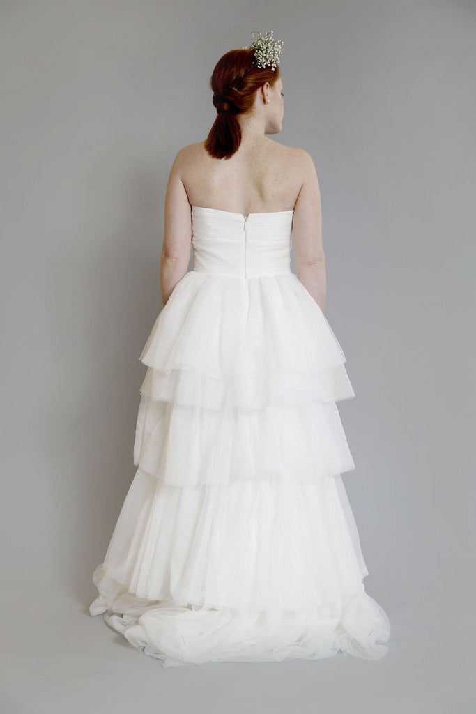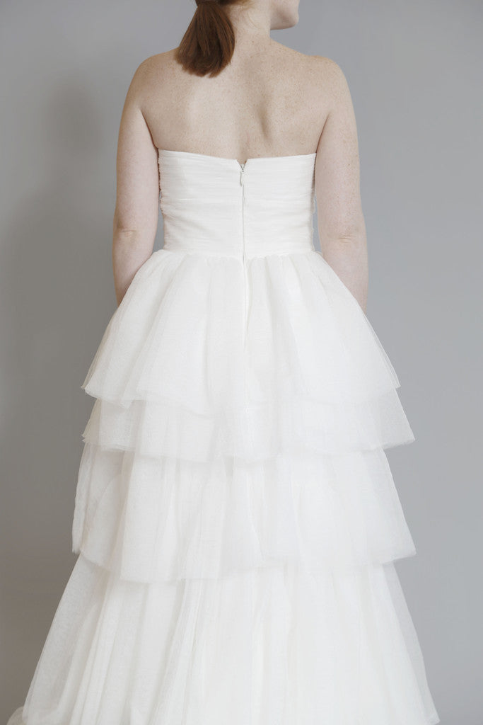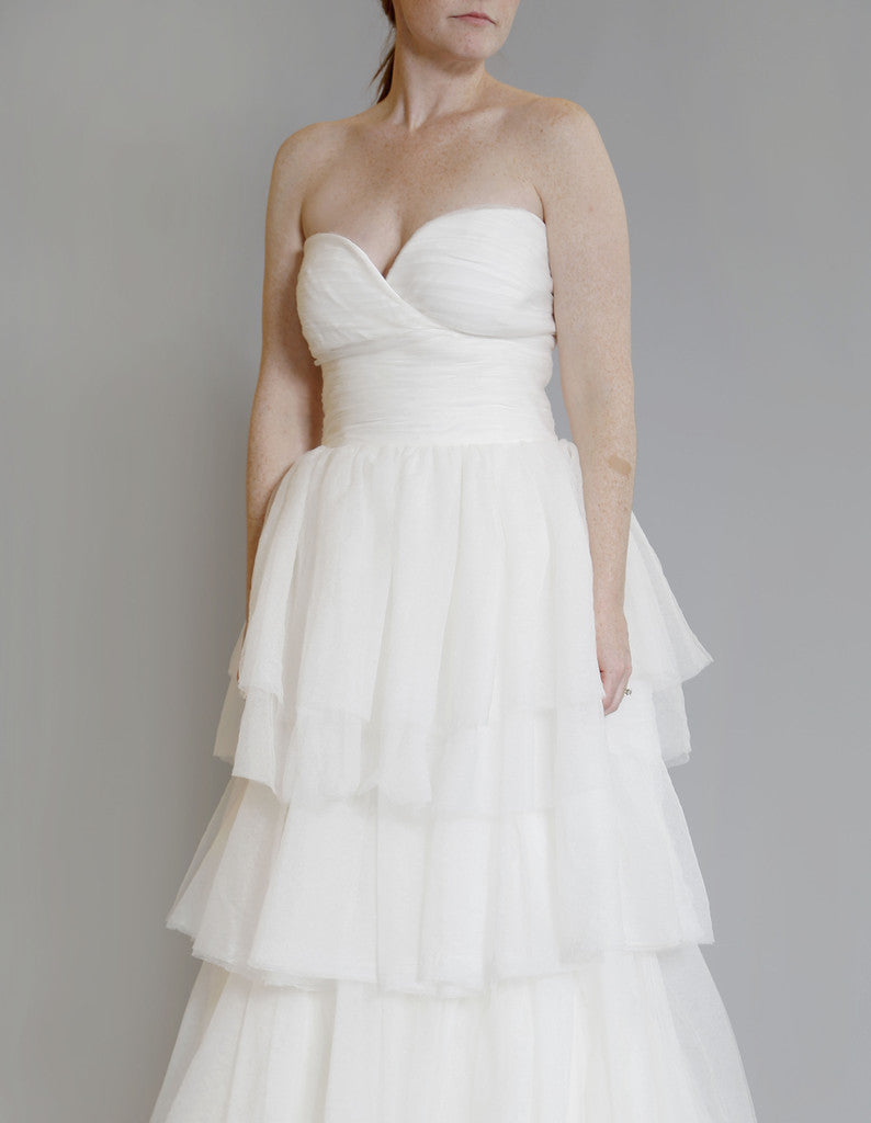 Stunning, Frilly, and Fun strapless silk tulle 'Atelier' dress by Monique Lhuillier Collection. Sweetheart neckline and baby soft silk tulle layers cascading to the floor. Very fine & soft silk tulle, flouncy with a lot of lift and movement Fitted through bust and hip. Fully lined. Dress is new. The dress has never been worn or altered. Purchased from Monique Lhuillier's atelier in LA.