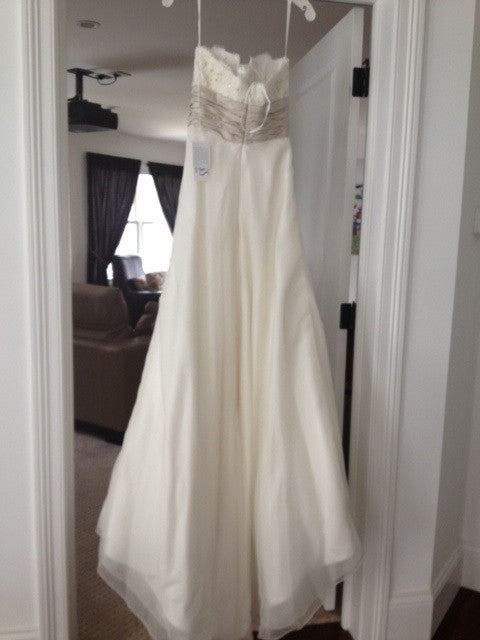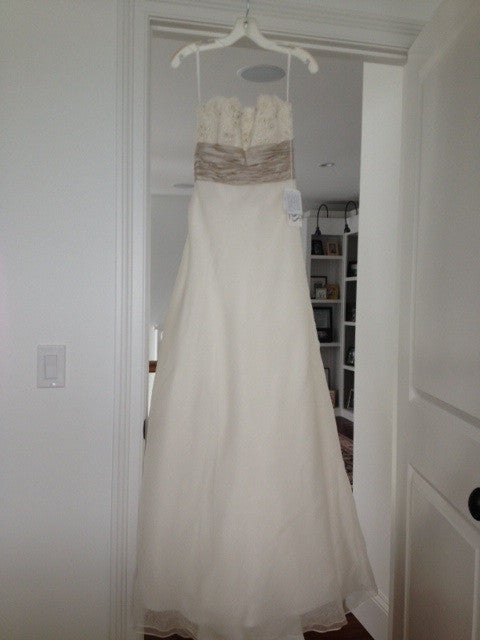 Monique Lhuillier 'Bliss' style 0902 is an ivory beaded lace gown with a silk organza A-line skirt. Light beige cummerbund at natural waist flatter any shape. Buttons continue down the back of the train. This dress is a size 4 and is brand new with tags.