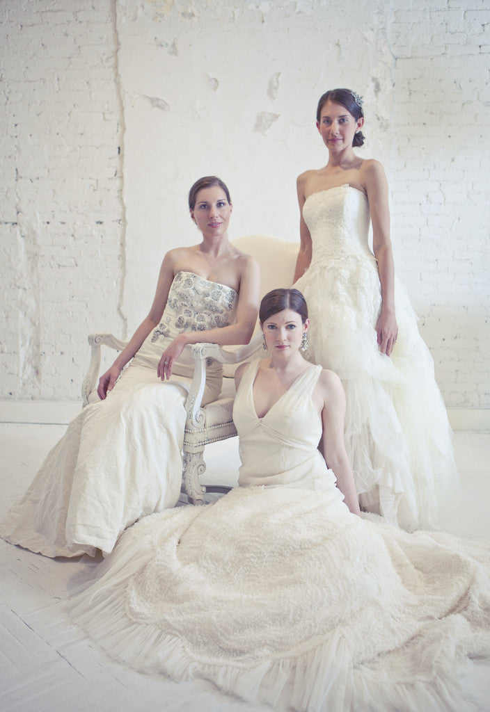 Strapless A-line Monique Lhuillier 'Josie' sheath with crystal embroidery and metallic knotting in a stacked beaded pattern. Sash is attached, bodice is strapless and fitted with interior boning. Fabric may be steamed for a smooth look, but gown also looks great with slightly crumpled look, as is shot on our model. As described in 'In Style Weddings - Winter 2009' (Magazine), "Metallic knots give this gown refined shimmer while adding a layer of dimension. Crystal appliques create even more texture and provide a polished finish."