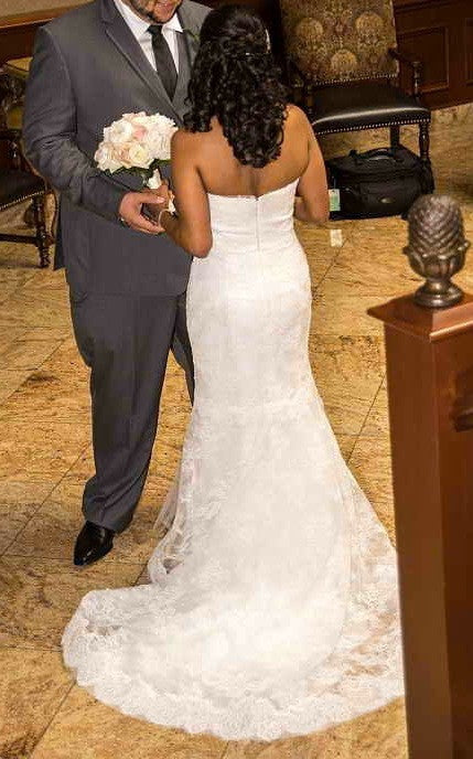 Stunning Monique Lhuillier Emma lace strapless wedding dress. Soft layers of tulle line the bottom of the dress. The sweetheart neckline flatters the bust, the waist can easily be accentuated with a sash at the natural waist. Slit that opens at the bottom for easy movement. Dress has been once worn & is in excellent condition.