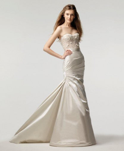 This gorgeous 2 piece Monique Lhuillier wedding gown includes a flattering embellished beaded lace bustier & lightweight satin trumpet floor length skirt. Corset can be tucked or untucked for two different look. Dress comes with a detachable bow belt. Dress is in excellent once worn condition. Professionally cleaned & packaged.