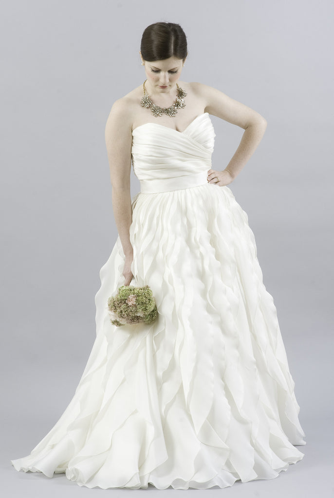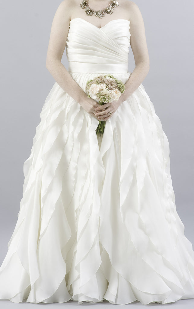 Monique Lhuillier delivers again with this gorgeous Winter ball gown. The Winter boasts a beautiful sweetheart strapless neckline with a skirt of cascading waves exuding a modern bohemian look. Detachable sleeves included to give the dress an off shoulder look. Sash is lightly affixed. Dress is new with tags, never altered. Was purchased from an authorized boutique.