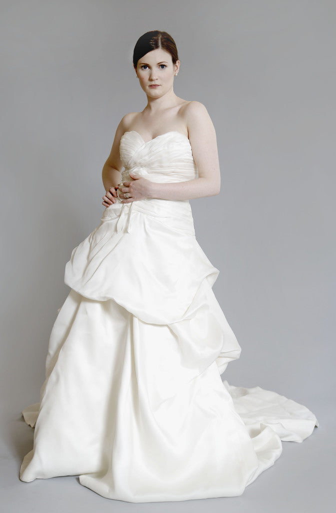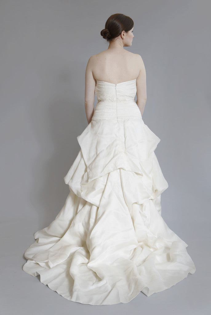 This Monique Lhuillier Yelena wedding dress has a sweetheart neck and a drop waist with a delicate lace tie. The top is ruched and the skirt is a light silk organza that gathers in places. Dress is in excellent once worn condition, professionally cleaned, pristine.