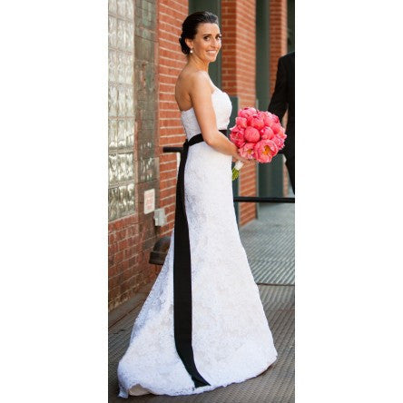 Oscar de la Renta 22n42 wedding dress in white Alencon lace hass over two layers of ivory silk taffeta. There is a stunning three point french bustle in the back of the gown as well as a row of buttons down the back which goes the length of the dress to the floor. This gown is a size 8, but was altered down to around a bridal size 6 in all measurements except for the bust. Dress has been once worn but is in pristine condition.