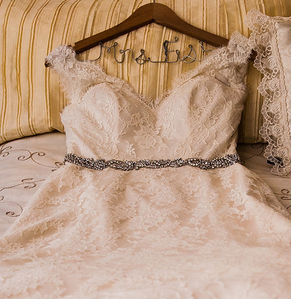 Gorgeous champagne colored Paloma Blanca Chantilly Lace wedding dress. Sleeveless V-neck lace bodice with beaded trim embellishment at waist. Fit and flare lace skirt. Sweep Train. Dress has sewn in bra cups and a French bustle. This dress has been once worn and is in great condition.
