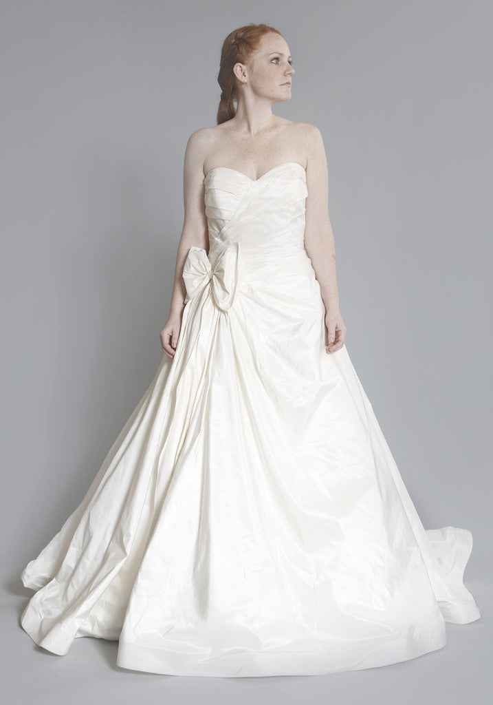 The Priscilla of Boston 'Maeve' is a strapless ball gown of silk taffeta with a small bow detail at the waist. Rich ivory color and fabric, very full ball gown for a classic bride. Dress is in excellent condition. It is a sample, never worn, slight dusting on underside of hem.