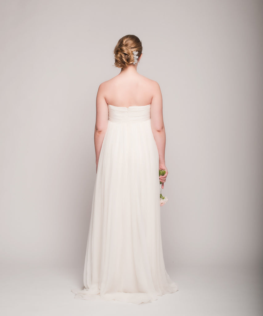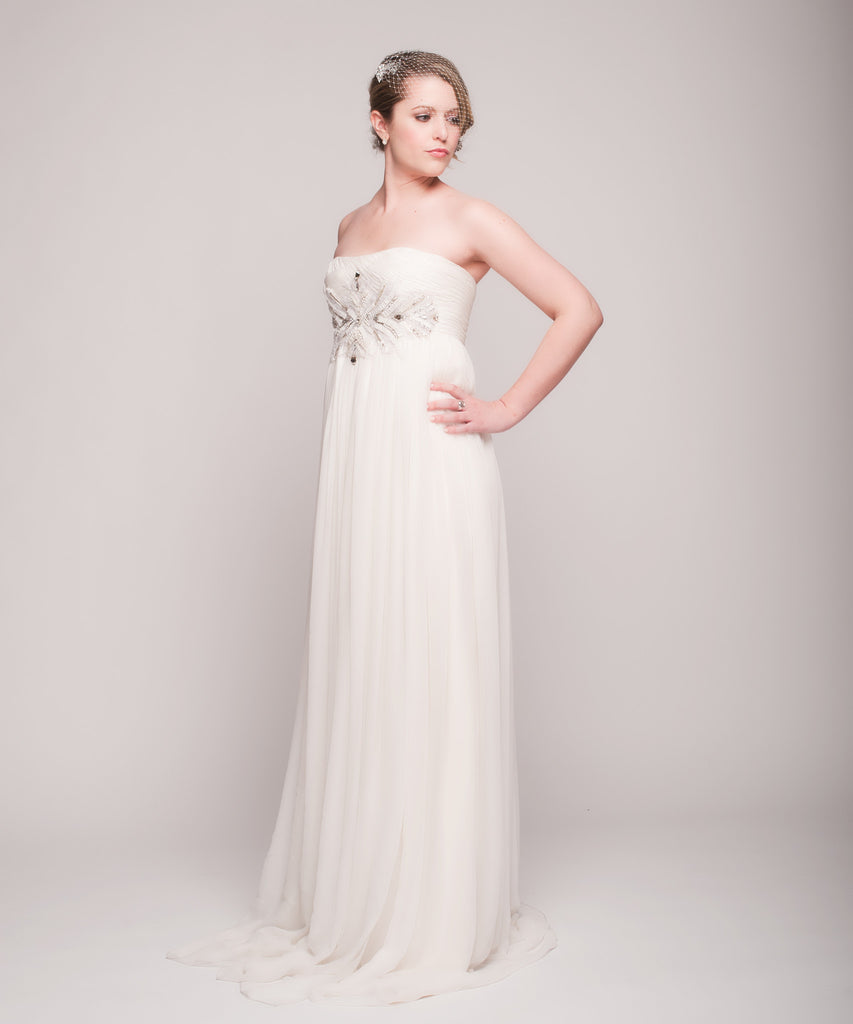 Ethereal but modern, this stunning floor length Reem Acra Hyacinth draped gown with empire embroidery. The lightweight chiffon is draped beautifully for a grecian look. Simple strapless neckline is accented with the beautiful intricate embroidery. This dress is new and has never been worn.