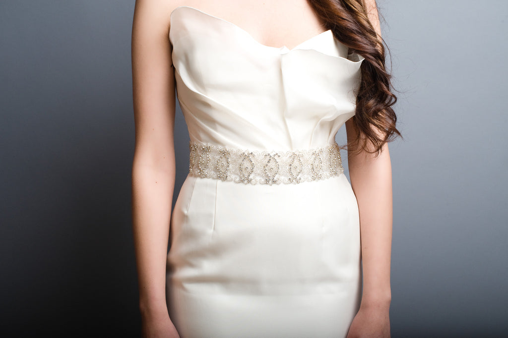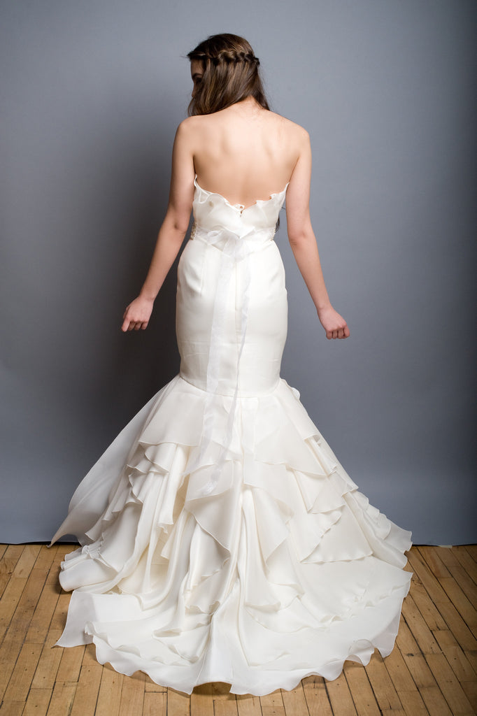 Breathtaking Rivini Balia Silk Taffeta Mermaid Wedding Gown. The ethereal bodice features a cascading tulip-like strapless detailing. The combination of the tulip layers & form fitting shape gives this dress a flattering & couture look. Dress is brand new & has never been worn. A thin crystal beaded belt comes with the gown. Dress is show with a Kirsten Kuehn Kali Crystal Art Deco Sash (available in Accessories).