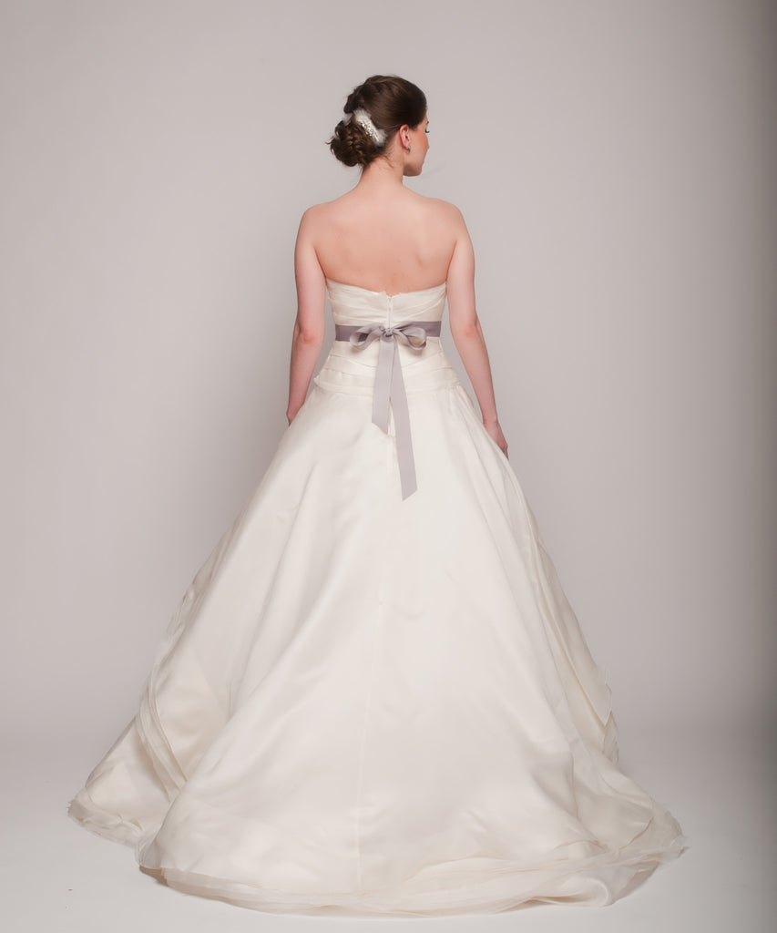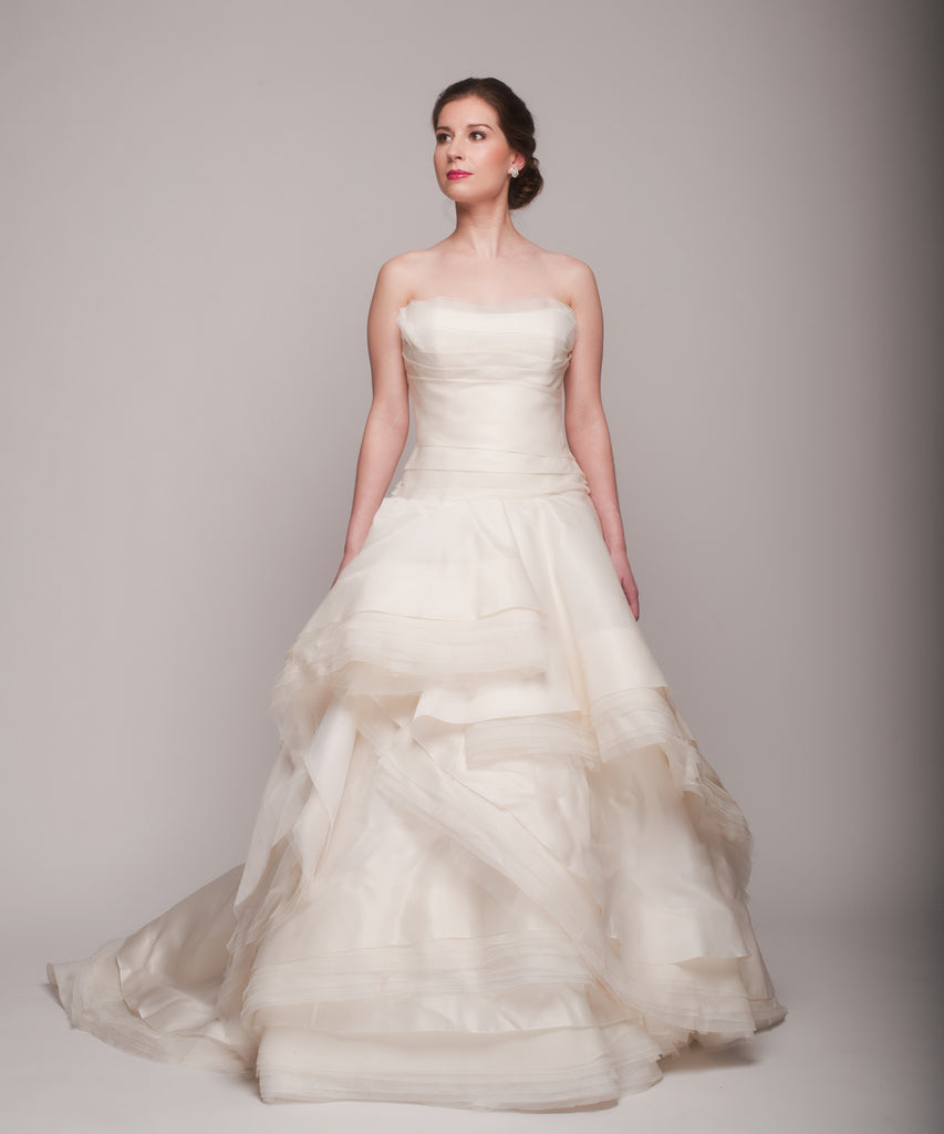 The Rivini Giselle is a modern romantic soft strapless ivory silk organza ball gown. The skirt on this gown features cascading peplum layers of raw edge silk organza and tulle. Dress Tagged at size 6. This dress has been once worn & is in great condition. Dress is shown with the 'Cassidy Belt', an exclusive piece by Hushed Commotion for Nearly Newlywed. Belt is not included with gown.
