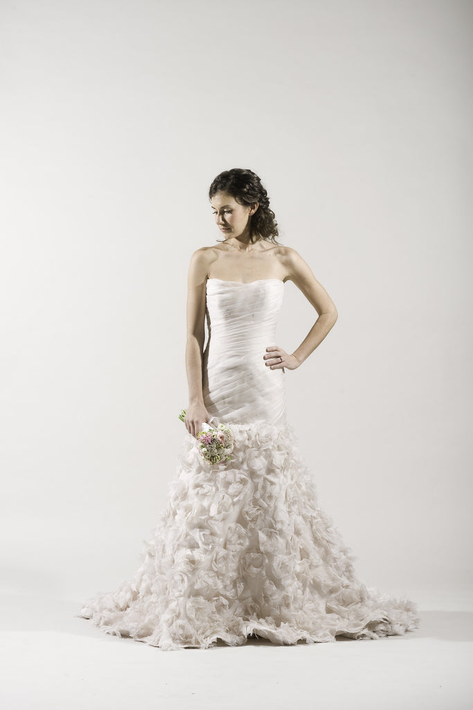 From Romona Keveza's Fall 2011 collection, this blush fitted dropped waist gown is feminine & dramatic. The strapless bodice is flattering in the luxurious draped silk organza. The mermaid silhouette is highlighted with gorgeous blush petals. Dress includes removable cups added in at bust and is in excellent once worn condition. Professionally cleaned & packaged.