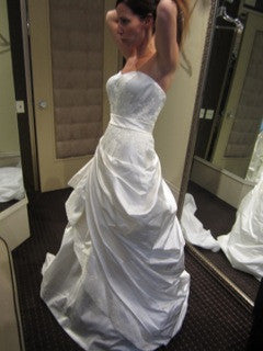This is a gorgeous Simone Carvalli trunk show dress that has never been worn or altered (tags still on the dress). Because it was purchased during a trunk show, it is an original style which makes it limited and even more special. The dress is ivory with ivory lace on the front, a satin sash along the waist and lace on the bottom as well as on the pick ups. The back of the dress is absolutely stunning. It has a sweetheart style low back that is unlike any other dress I’ve seen. The dress also has beautiful pick ups throughout making it different from all other styles out there. It is a classic beauty and will be stunning for years to come. The style number is 90148 if you would like to google it for professional pictures.. it is simply breathtaking and will be a timeless classic.