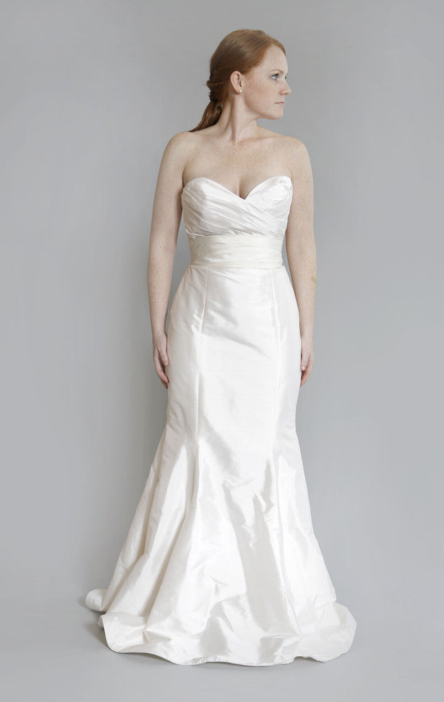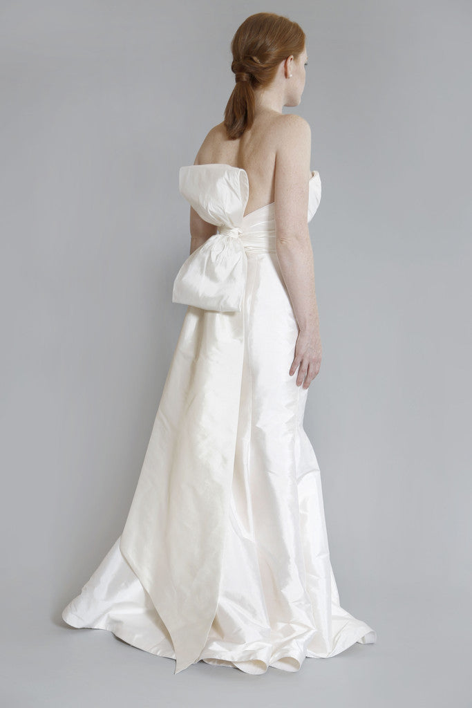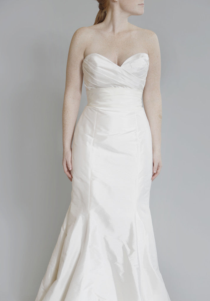 The Tara Keely TK2060 is an ivory tissue taffeta trumpet bridal gown with a draped sweetheart bodice. Ivory tissue taffeta removable gathered sash, with a sculpted bow give an option for a dramatic and modern appeal. The large bow can be shaped in different ways, we styled it here to have a 'kimono-esque' feel. Chapel train. A stunning, simple, modern gown with a nice architectural touch. Dress Size 10. Excellent once worn condition. Professionally cleaned.