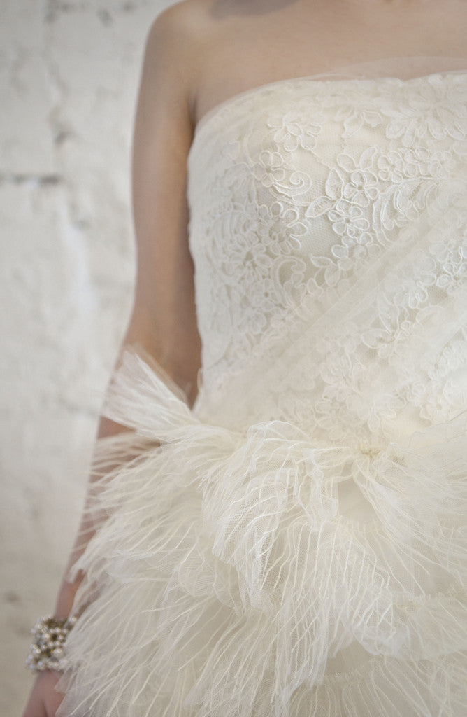 Vera Wang 'Eva' boasts an asymmetrical, tulle feather skirt and a gorgeous lace bodice. The tulle in the back drapes beautifully to form a dramatic train. It includes a black sash and incredible horsehair bow sash (neither pictured.) Dress is in excellent once worn condition. Purchased at Vera Wang Charleston, professionally cleaned and preserved.