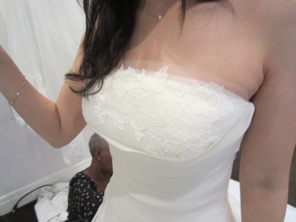 The Vera Wang Luxe Kimberly wedding dress is a modern princess dress, the lushness of a ballgown but designed in a way that flatters. The silhouetted is executed to flatter the body in all the right places, really flatters bust and waistline. The construction of dress really emphasizes continuous movement. From the bodice to the base of the dress, there are full-length, bias tiers of organza. The layers are uninterrupted, with no seam between the skirt and bodice, giving it this perfect fluidity that really flatters the bodyline. Delicate chantilly lace applique at neckline and train. Ruffled, cascading effect in the bottom of the skirt. This dress was worn 2 hours for a ceremony and is in pristine condition (except minimal fraying at bottom of hem, due to organza fabric). Dress tag 2, dress was altered without cutting any seams - so dress can be let out a bit. Includes sewn in cups and a bustle for the train (though I never ended up bustling). The one place that I had adjusted was the floral decorative piece at the front of the dress - I had minimized so that it looked more natural against the dress.