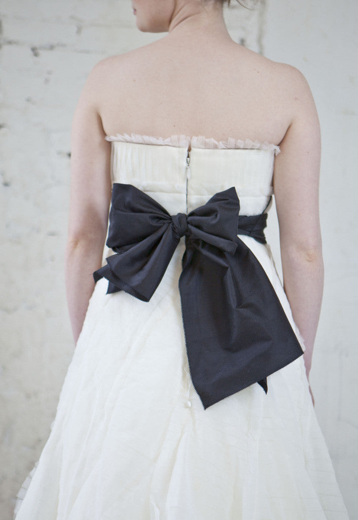 Vera Wang Luxe Briana dress from the Fall 2007 season. Light ivory strapless french tulle swirl dress. Soft, flowing layers combined with a black raw taffeta sash to accentuate the waistline. Belt is removable if desired. Dress is in excellent once worn condition, professionally cleaned and stored.