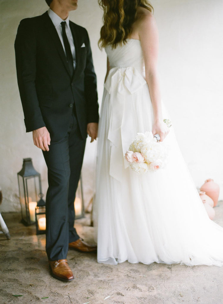Gorgeous & ethereal Vera Wang silk wedding dress. With a simple A-line silhouette, the strapless bodice features an intricate weave detailing at bust. Sash tied under bust. Dress was slightly taken in at waist & bust cups were added. Dress has been once worn & professionally cleaned.