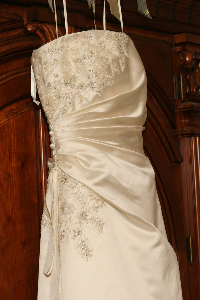 Gorgeous and elegant STRAPLESS Vera wang mermaid gown WITH side draped detail and scattered flower embroidery. This dress has been once worn and is in excellent condition.